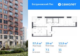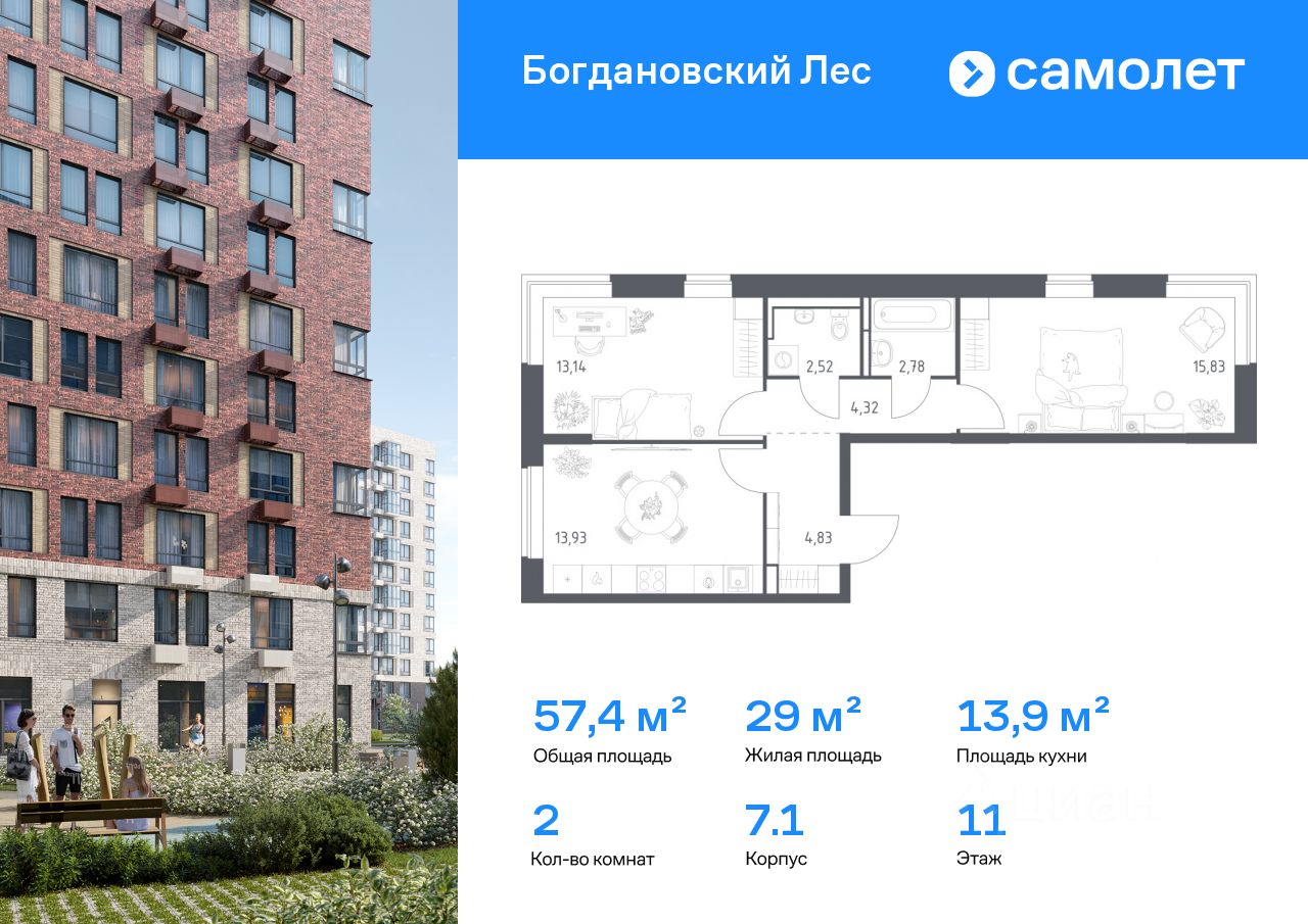 Строим кварталы для жизни с заботой о будущем. Предлагается 2-комнатная квартира комфорт-класса 57,35 кв.м в корпусе 7.1 на 11 этаже, в ЖК "Богдановский Лес"