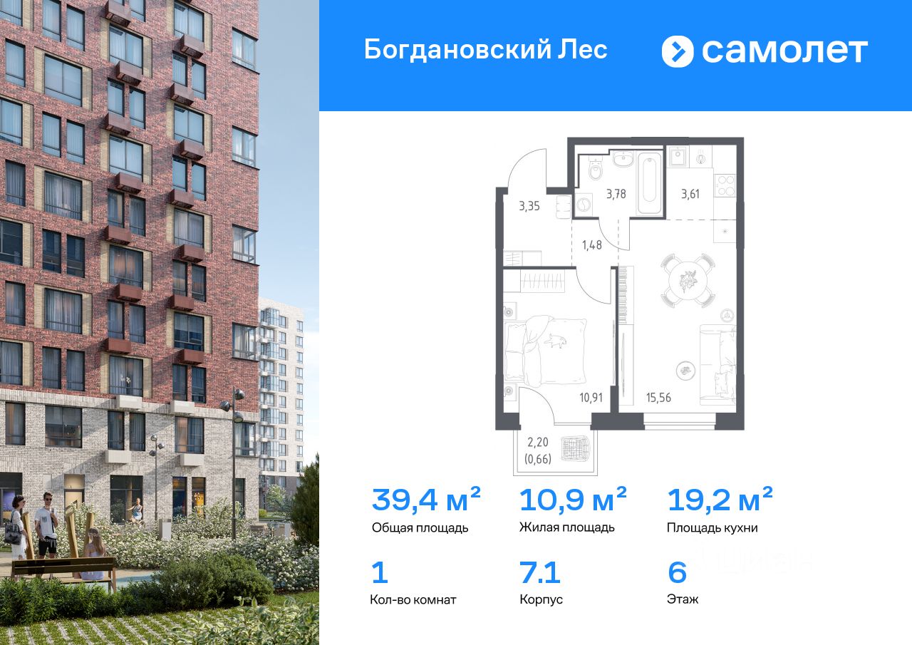 Строим кварталы для жизни с заботой о будущем. Предлагается 1-комнатная квартира комфорт-класса 39,35 кв.м в корпусе 7.1 на 6 этаже, в ЖК "Богдановский Лес"