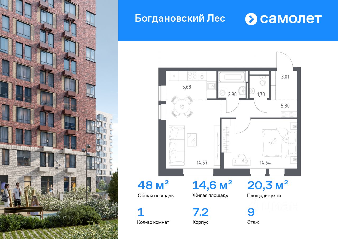Строим кварталы для жизни с заботой о будущем. Предлагается 1-комнатная квартира комфорт-класса 47,96 кв.м в корпусе 7.2 на 9 этаже, в ЖК "Богдановский Лес"