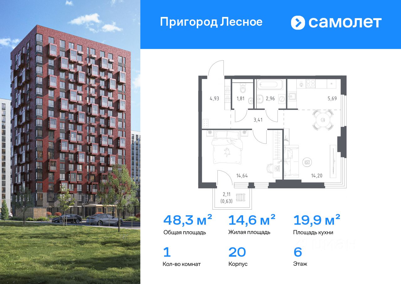 Строим кварталы для жизни с заботой о будущем. Предлагается 1-комнатная квартира комфорт-класса 48,27 кв.м в корпусе 20 на 6 этаже, в ЖК "Пригород Лесное"