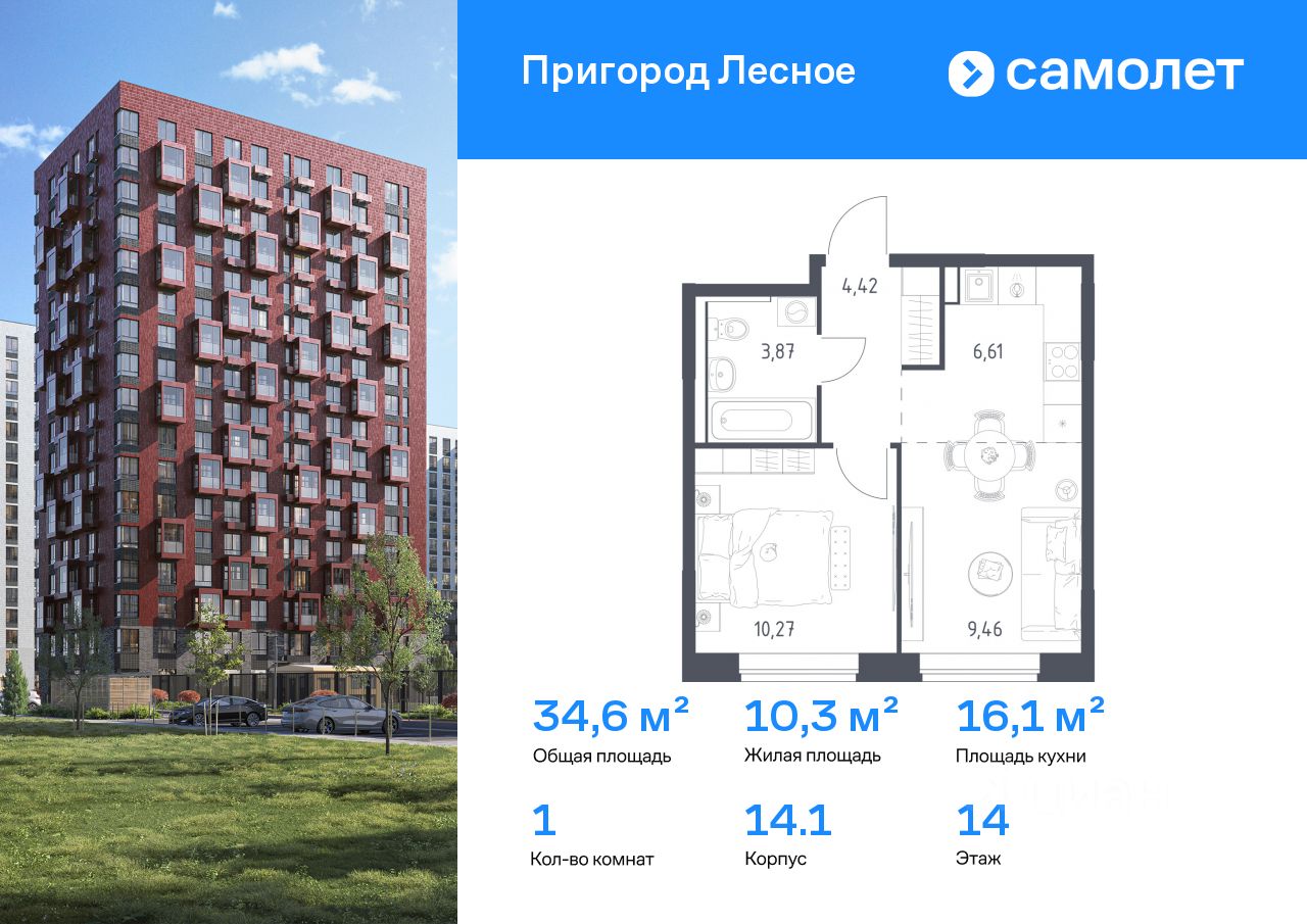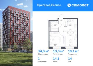Строим кварталы для жизни с заботой о будущем. Предлагается 1-комнатная квартира комфорт-класса 34,63 кв.м в корпусе 14.1 на 14 этаже, в ЖК "Пригород Лесное"