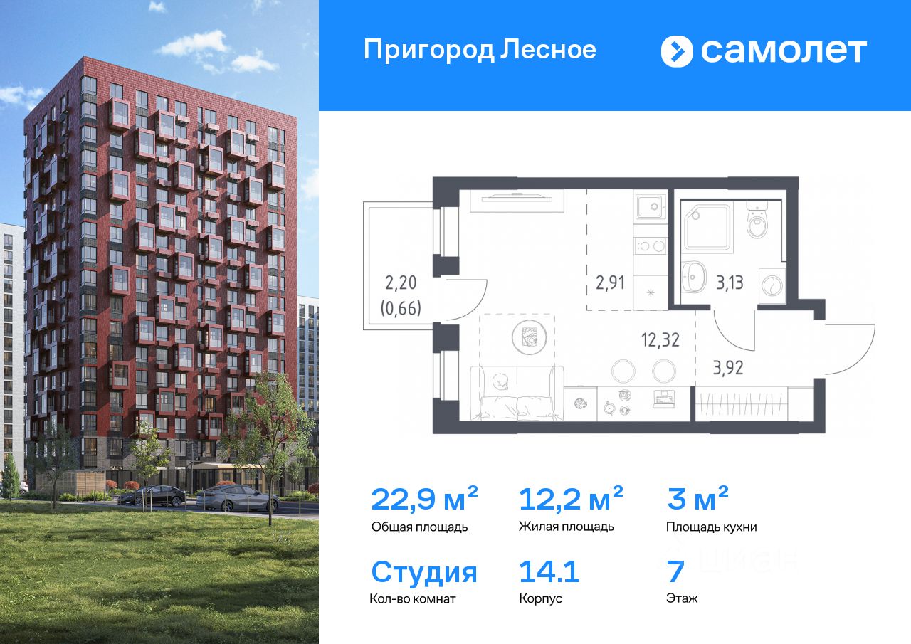 Строим кварталы для жизни с заботой о будущем. Предлагается квартира студия комфорт-класса 22,94 кв.м в корпусе 14.1 на 7 этаже, в ЖК "Пригород Лесное"