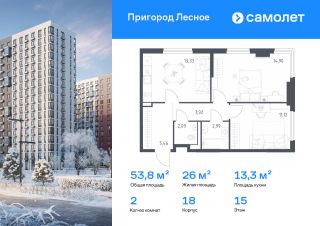 Строим кварталы для жизни с заботой о будущем. Предлагается 2-комнатная квартира комфорт-класса 53,81 кв.м в корпусе 18 на 15 этаже, в ЖК "Пригород Лесное"