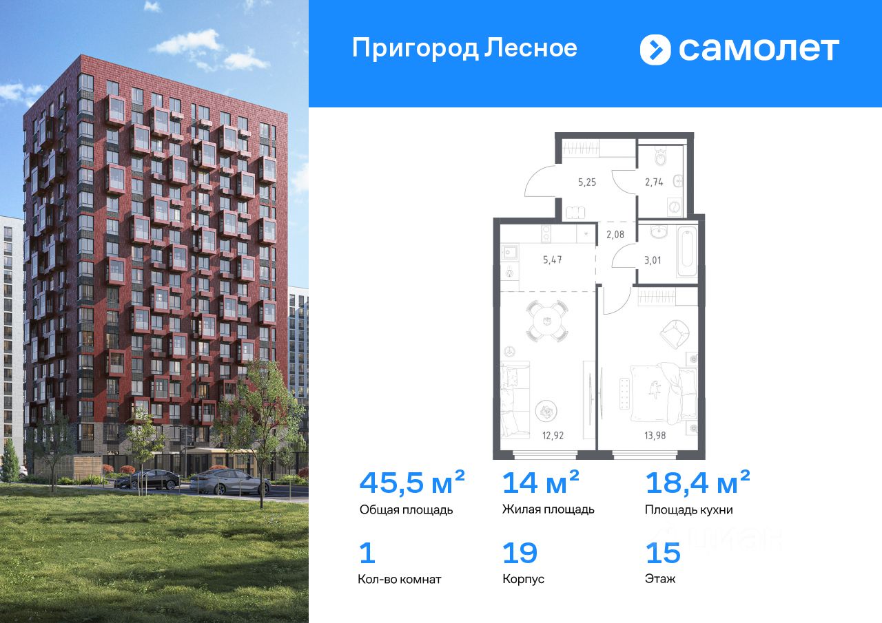 Строим кварталы для жизни с заботой о будущем. Предлагается 1-комнатная квартира комфорт-класса 45,45 кв.м в корпусе 19 на 15 этаже, в ЖК "Пригород Лесное"