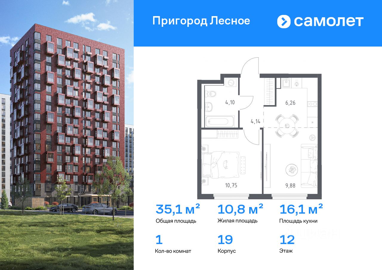 Строим кварталы для жизни с заботой о будущем. Предлагается 1-комнатная квартира комфорт-класса 35,13 кв.м в корпусе 19 на 12 этаже, в ЖК "Пригород Лесное"