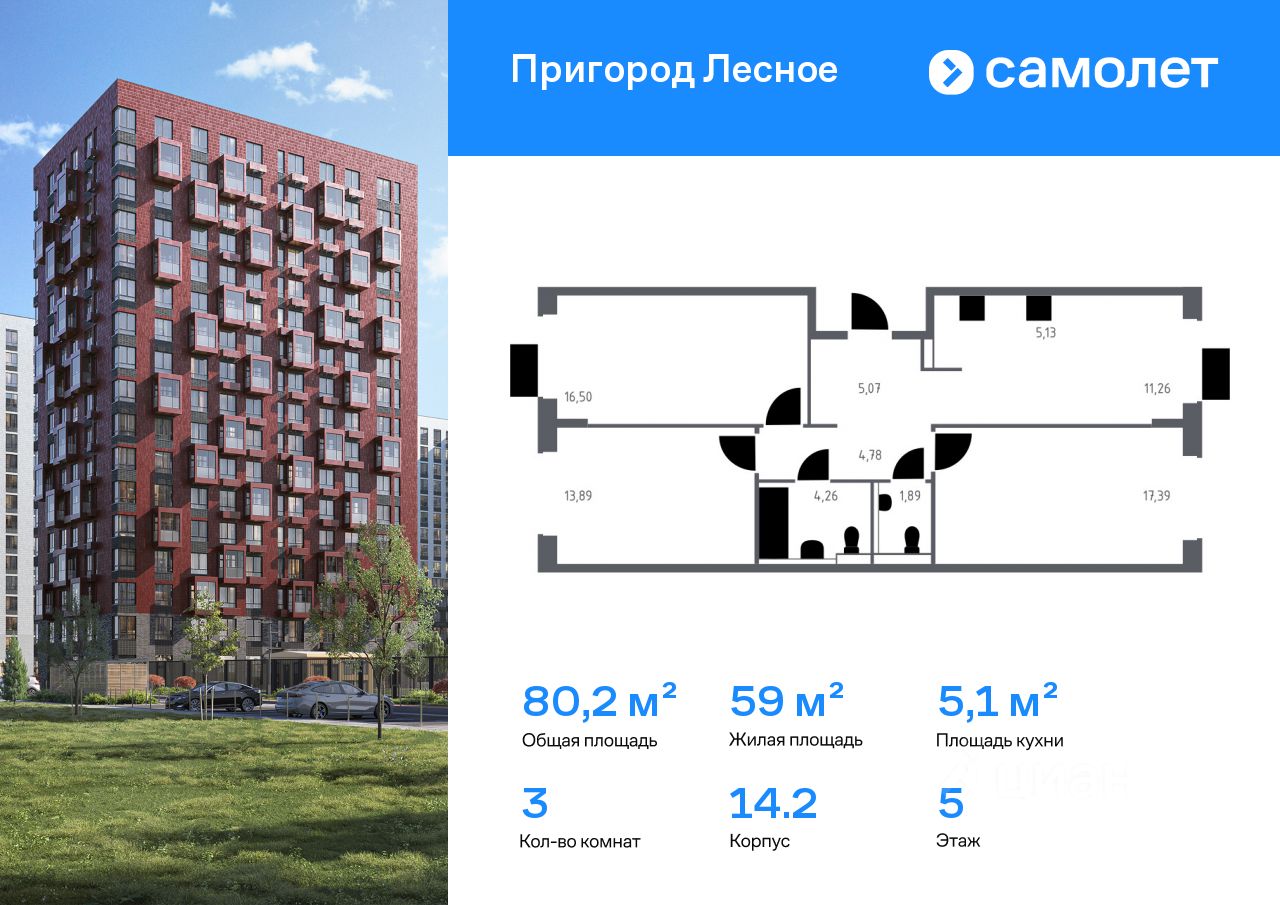 Строим кварталы для жизни с заботой о будущем. Предлагается 3-комнатная квартира комфорт-класса 80,17 кв.м в корпусе 14.2 на 5 этаже, в ЖК "Пригород Лесное"
