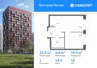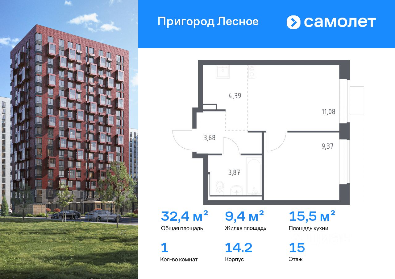 Строим кварталы для жизни с заботой о будущем. Предлагается 1-комнатная квартира комфорт-класса 32,39 кв.м в корпусе 14.2 на 15 этаже, в ЖК "Пригород Лесное"