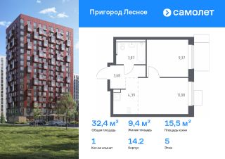 Строим кварталы для жизни с заботой о будущем. Предлагается 1-комнатная квартира комфорт-класса 32,39 кв.м в корпусе 14.2 на 5 этаже, в ЖК "Пригород Лесное"