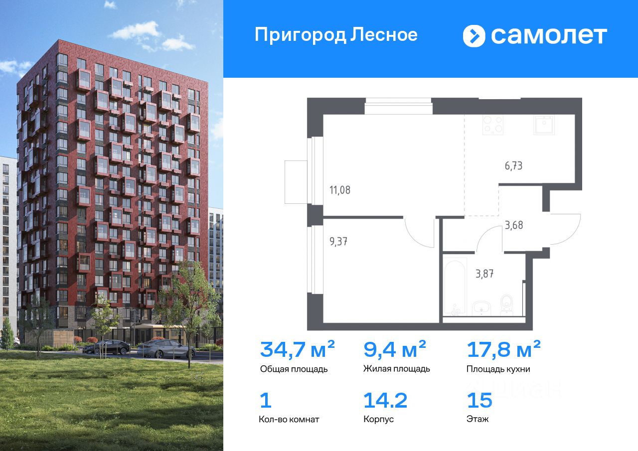 Строим кварталы для жизни с заботой о будущем. Предлагается 1-комнатная квартира комфорт-класса 34,73 кв.м в корпусе 14.2 на 15 этаже, в ЖК "Пригород Лесное"
