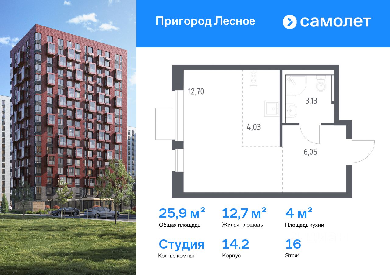 Строим кварталы для жизни с заботой о будущем. Предлагается квартира студия комфорт-класса 25,91 кв.м в корпусе 14.2 на 16 этаже, в ЖК "Пригород Лесное"
