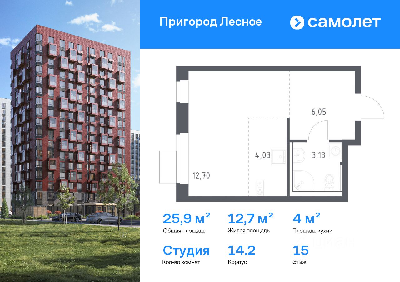 Строим кварталы для жизни с заботой о будущем. Предлагается квартира студия комфорт-класса 25,91 кв.м в корпусе 14.2 на 15 этаже, в ЖК "Пригород Лесное"