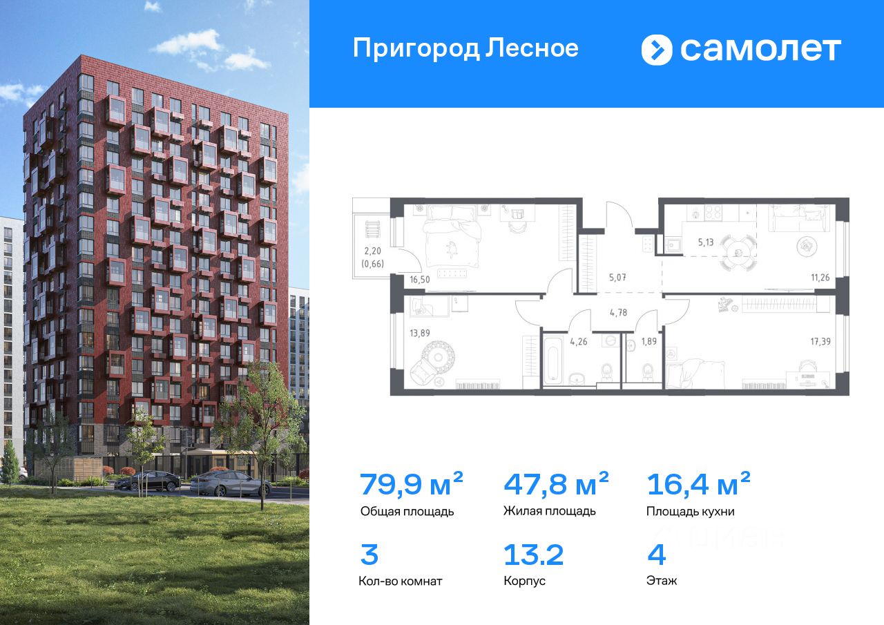 Строим кварталы для жизни с заботой о будущем. Предлагается 3-комнатная квартира комфорт-класса 79,9 кв.м в корпусе 13.2 на 4 этаже, в ЖК "Пригород Лесное"