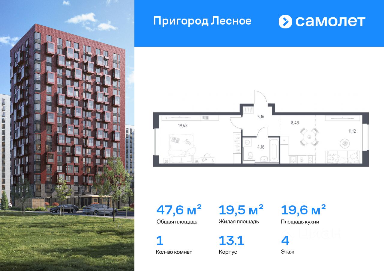 Строим кварталы для жизни с заботой о будущем. Предлагается 1-комнатная квартира комфорт-класса 47,6 кв.м в корпусе 13.1 на 4 этаже, в ЖК "Пригород Лесное"