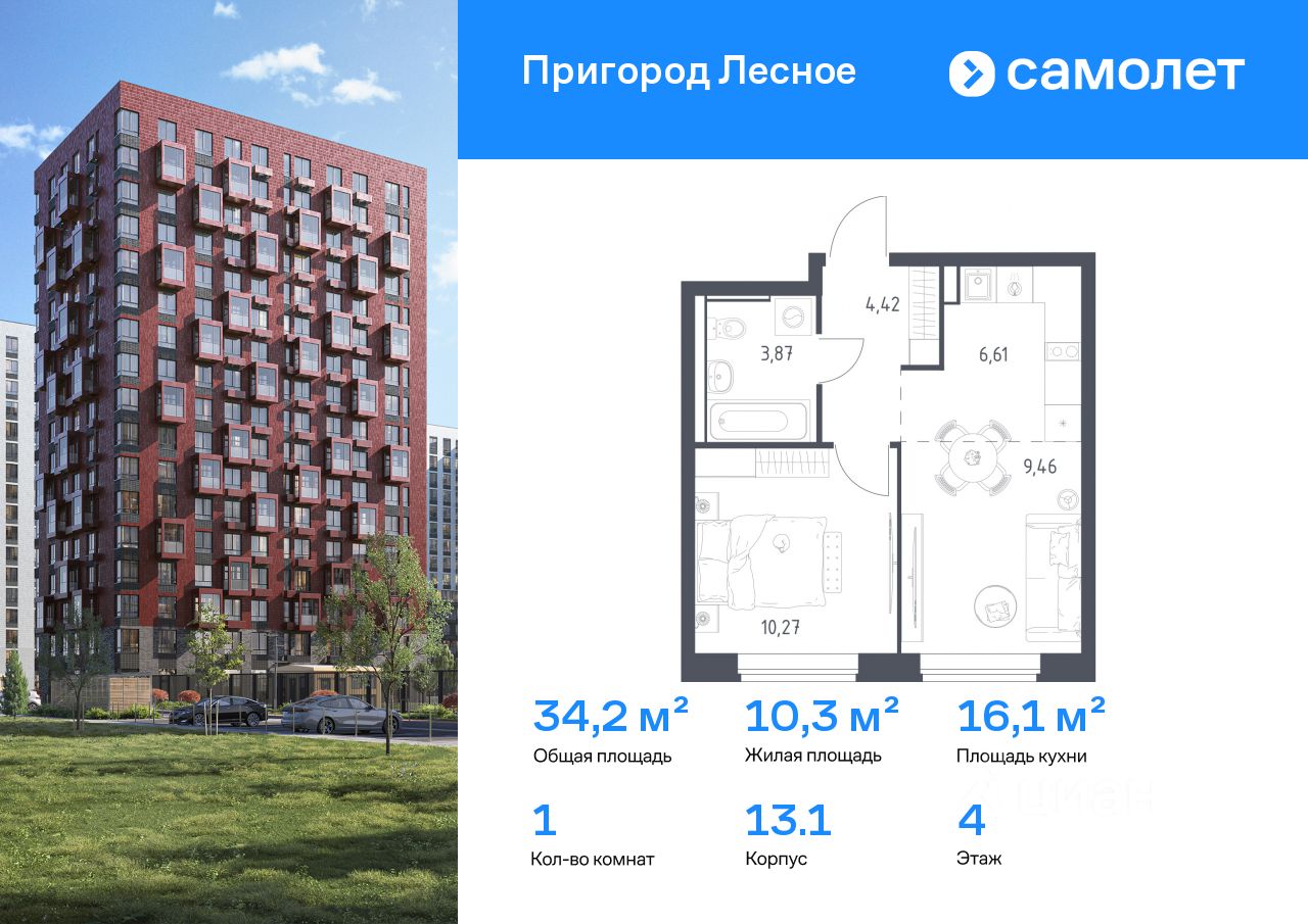 Строим кварталы для жизни с заботой о будущем. Предлагается 1-комнатная квартира комфорт-класса 34,2 кв.м в корпусе 13.1 на 4 этаже, в ЖК "Пригород Лесное"
