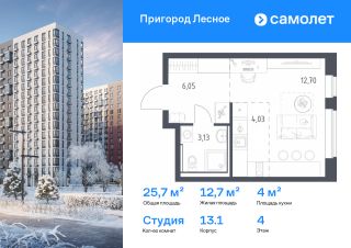 Строим кварталы для жизни с заботой о будущем. Предлагается квартира студия комфорт-класса 25,7 кв.м в корпусе 13.1 на 4 этаже, в ЖК "Пригород Лесное"
