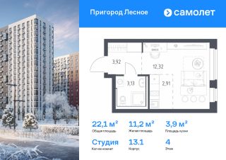 Строим кварталы для жизни с заботой о будущем. Предлагается квартира студия комфорт-класса 22,1 кв.м в корпусе 13.1 на 4 этаже, в ЖК "Пригород Лесное"