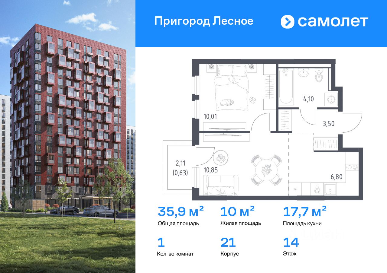 Строим кварталы для жизни с заботой о будущем. Предлагается 1-комнатная квартира комфорт-класса 35,89 кв.м в корпусе 21 на 14 этаже, в ЖК "Пригород Лесное"