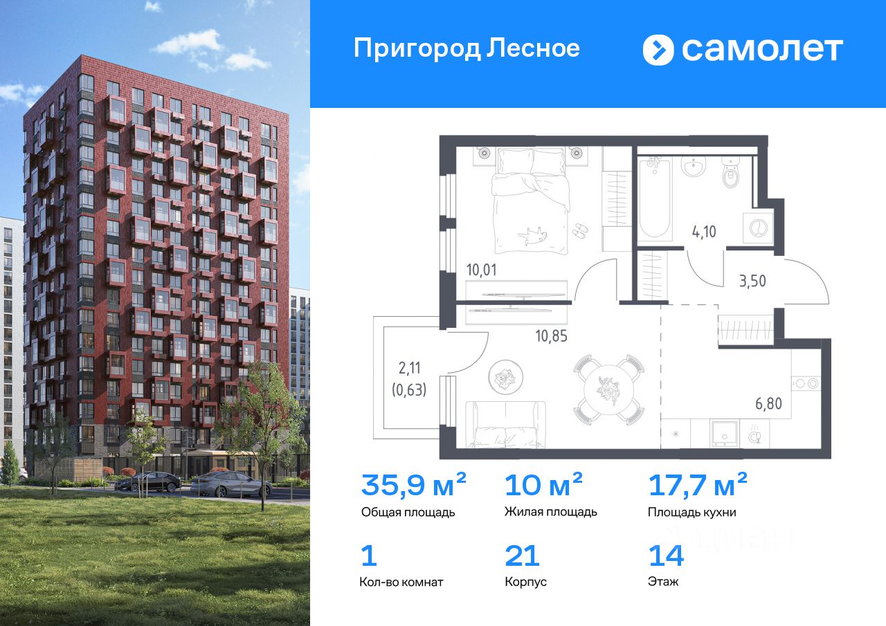 Строим кварталы для жизни с заботой о будущем. Предлагается 1-комнатная квартира комфорт-класса 35,89 кв.м в корпусе 21 на 14 этаже, в ЖК "Пригород Лесное"