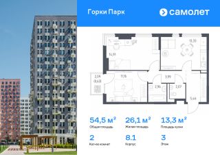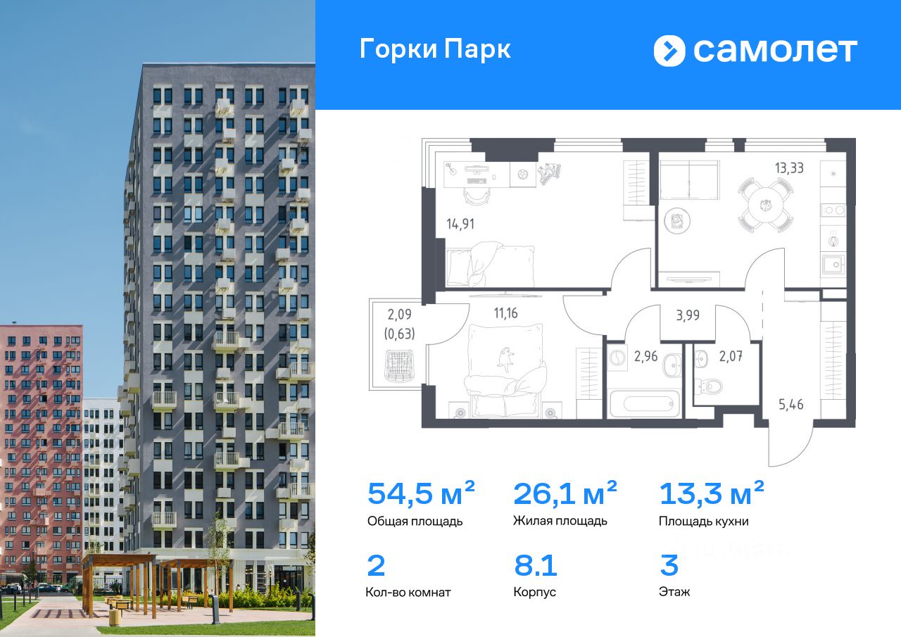 Строим кварталы для жизни с заботой о будущем. Предлагается 2-комнатная квартира комфорт-класса 54,51 кв.м в корпусе 8.1 на 3 этаже, в ЖК "Горки Парк"