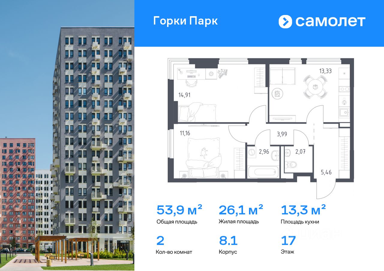 Строим кварталы для жизни с заботой о будущем. Предлагается 2-комнатная квартира комфорт-класса 53,88 кв.м в корпусе 8.1 на 17 этаже, в ЖК "Горки Парк"