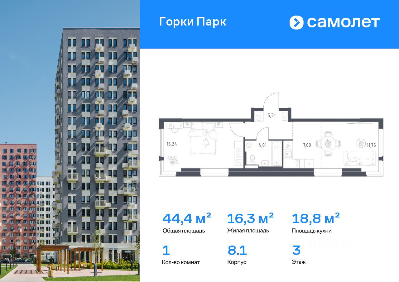 Строим кварталы для жизни с заботой о будущем. Предлагается 1-комнатная квартира комфорт-класса 44,41 кв.м в корпусе 8.1 на 3 этаже, в ЖК "Горки Парк"