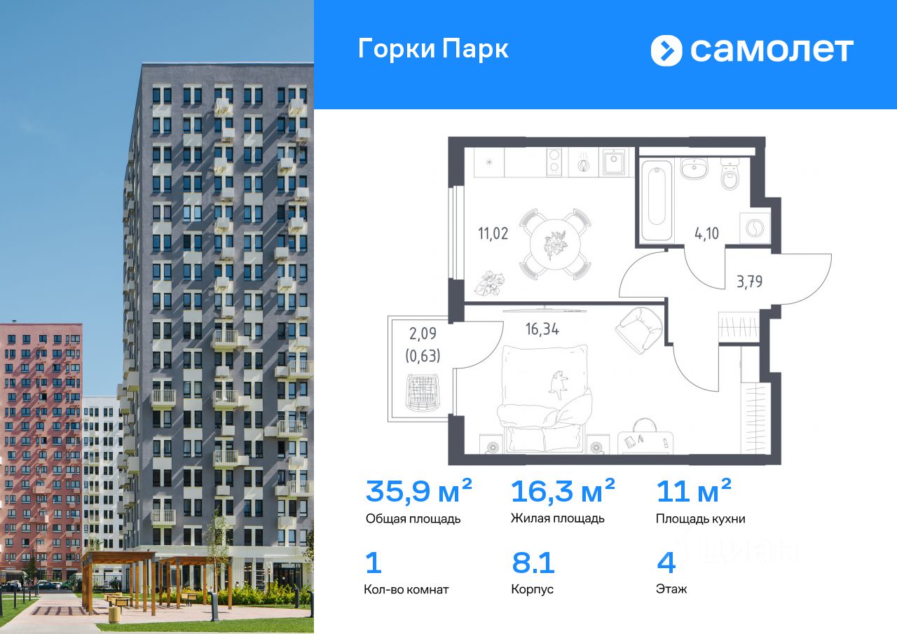Строим кварталы для жизни с заботой о будущем. Предлагается 1-комнатная квартира комфорт-класса 35,88 кв.м в корпусе 8.1 на 4 этаже, в ЖК "Горки Парк"