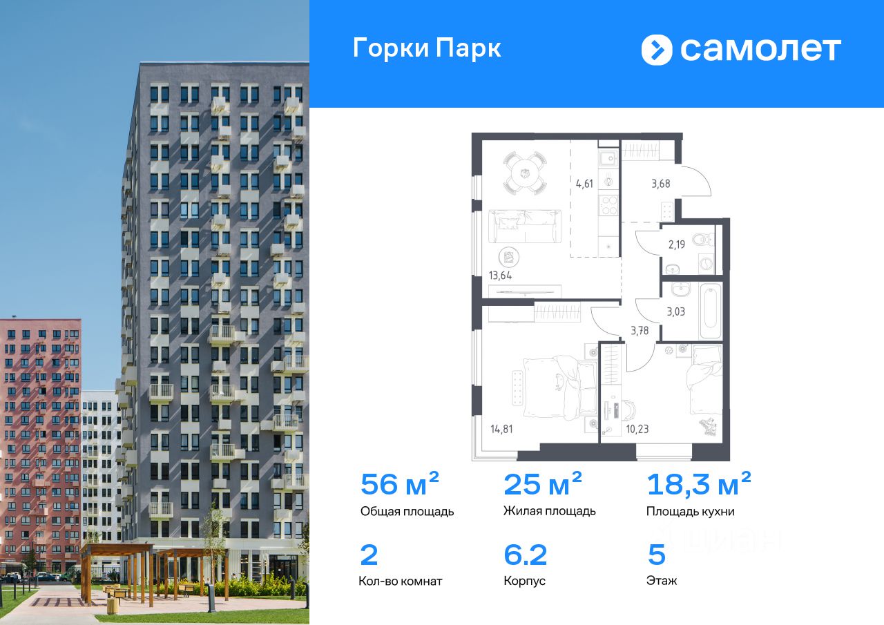 Строим кварталы для жизни с заботой о будущем. Предлагается 2-комнатная квартира комфорт-класса 55,97 кв.м в корпусе 6.2 на 5 этаже, в ЖК "Горки Парк"