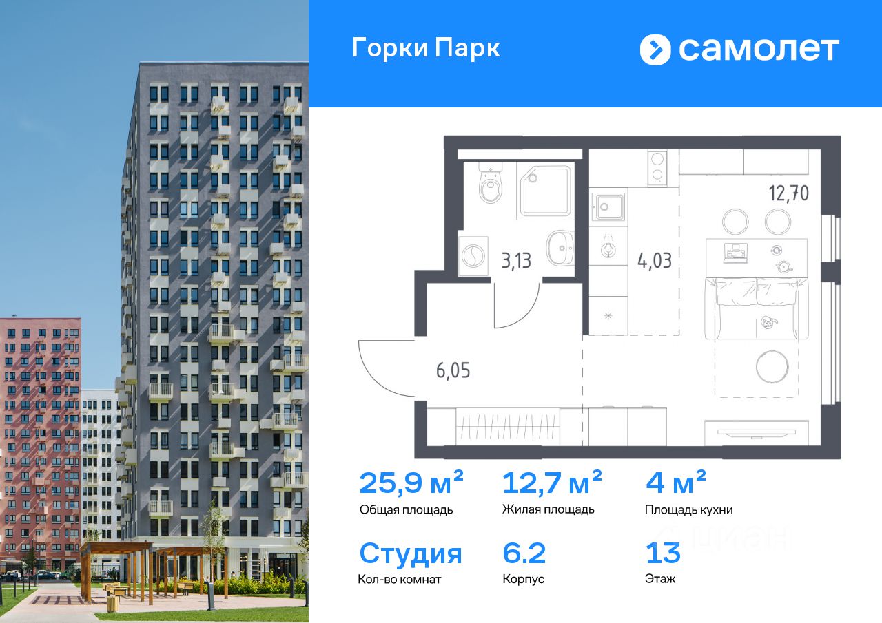 Строим кварталы для жизни с заботой о будущем. Предлагается квартира студия комфорт-класса 25,91 кв.м в корпусе 6.2 на 13 этаже, в ЖК "Горки Парк"