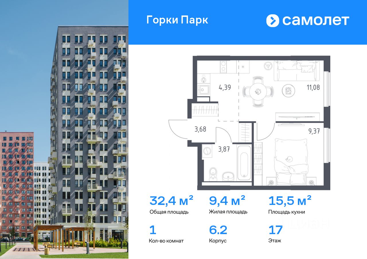 Строим кварталы для жизни с заботой о будущем. Предлагается 1-комнатная квартира комфорт-класса 32,39 кв.м в корпусе 6.2 на 17 этаже, в ЖК "Горки Парк"