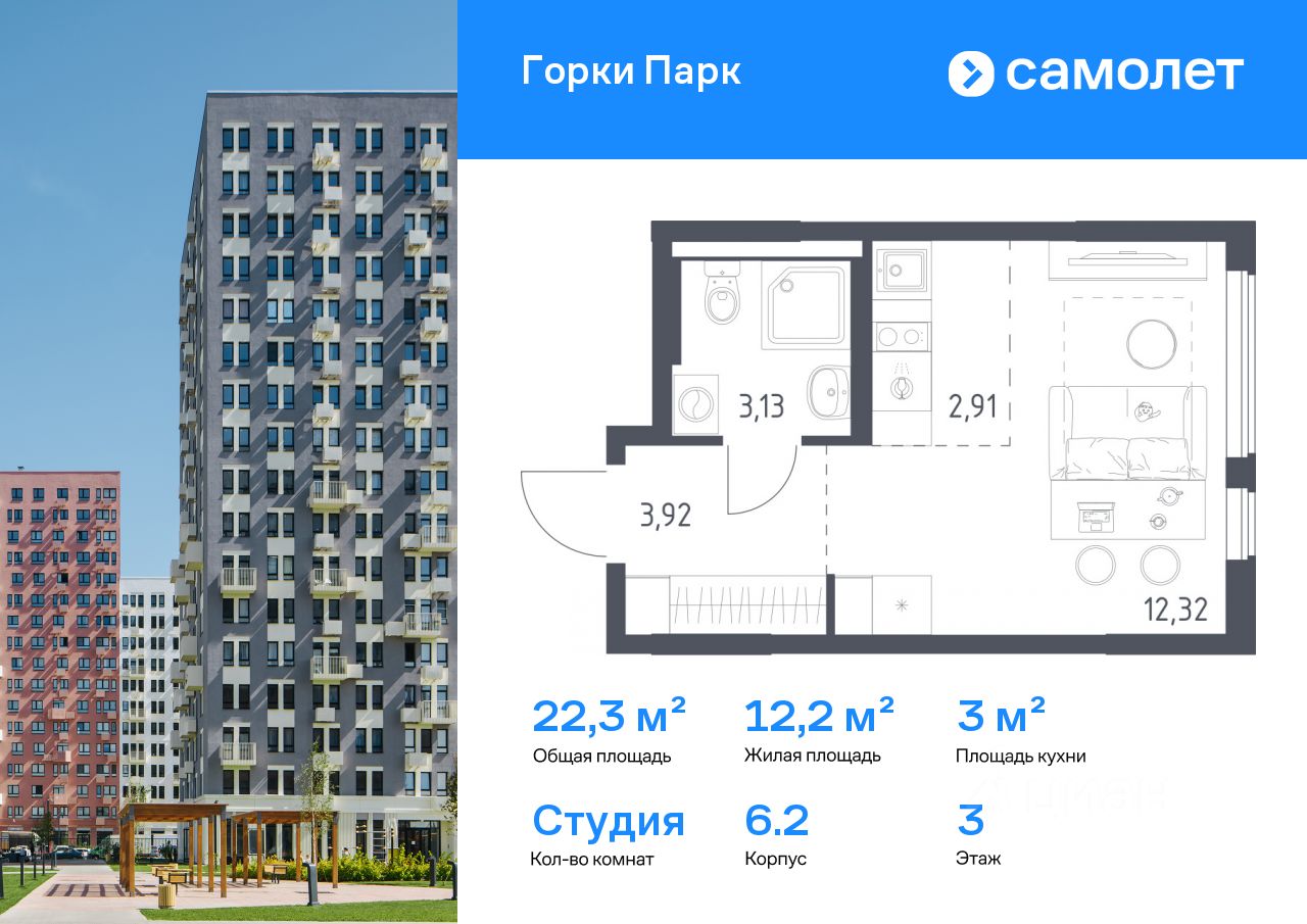 Строим кварталы для жизни с заботой о будущем. Предлагается квартира студия комфорт-класса 22,28 кв.м в корпусе 6.2 на 3 этаже, в ЖК "Горки Парк"