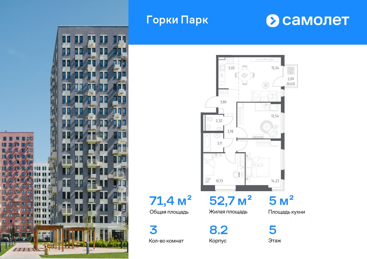 Строим кварталы для жизни с заботой о будущем. Предлагается 3-комнатная квартира комфорт-класса 71,4 кв.м в корпусе 8.2 на 5 этаже, в ЖК "Горки Парк"