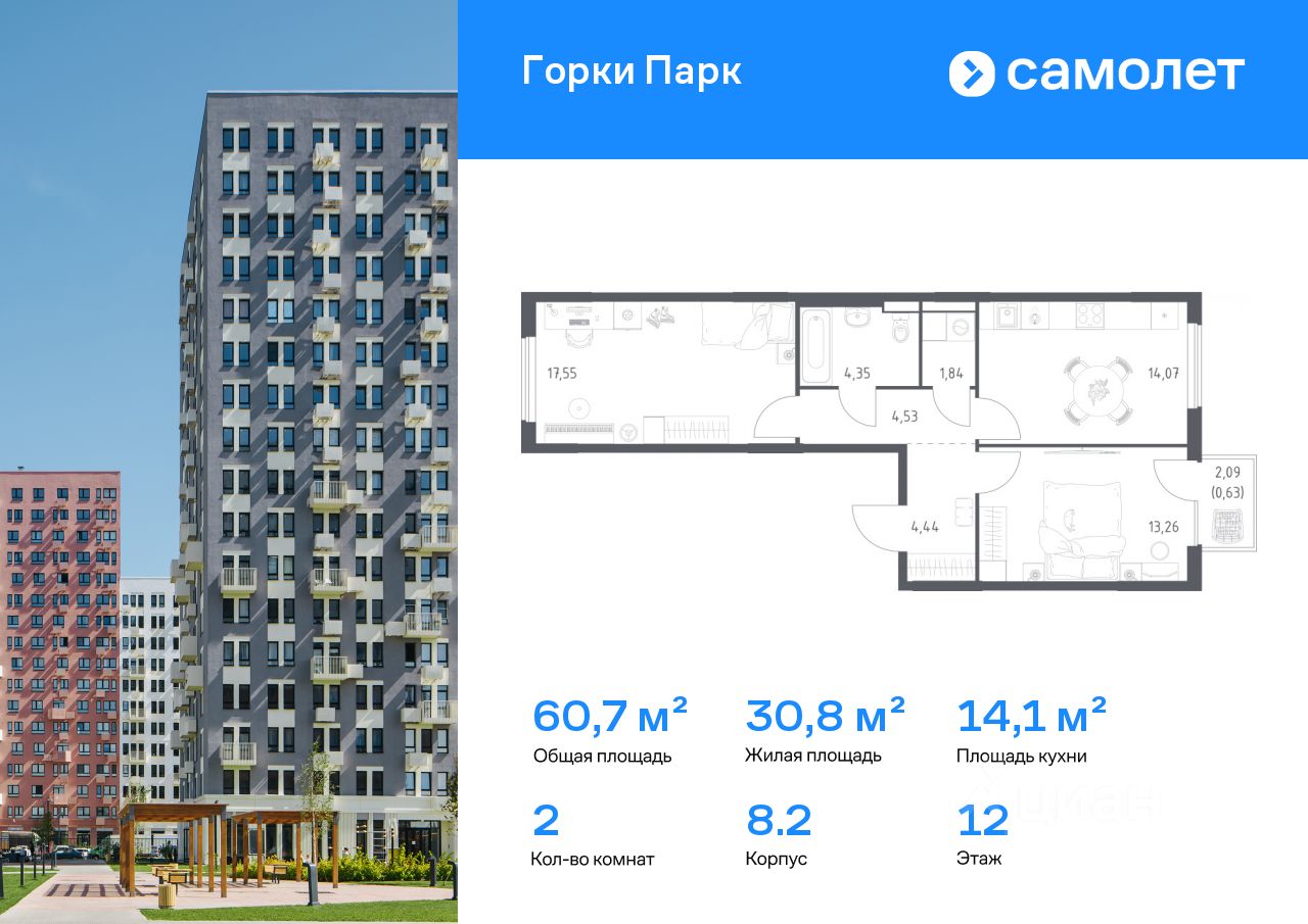 Строим кварталы для жизни с заботой о будущем. Предлагается 2-комнатная квартира комфорт-класса 60,67 кв.м в корпусе 8.2 на 12 этаже, в ЖК "Горки Парк"