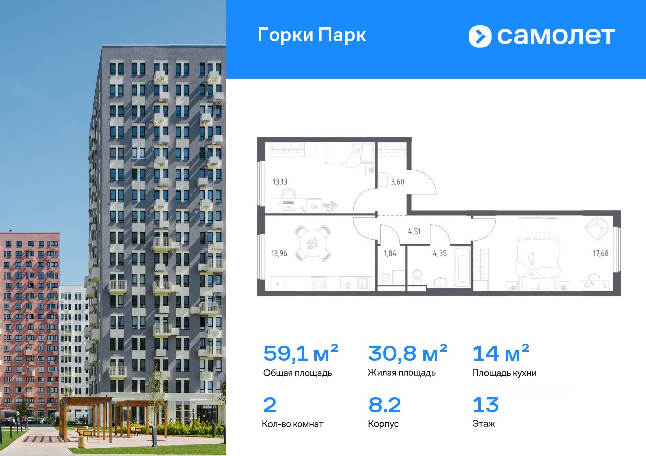 Строим кварталы для жизни с заботой о будущем. Предлагается 2-комнатная квартира комфорт-класса 59,07 кв.м в корпусе 8.2 на 13 этаже, в ЖК "Горки Парк"