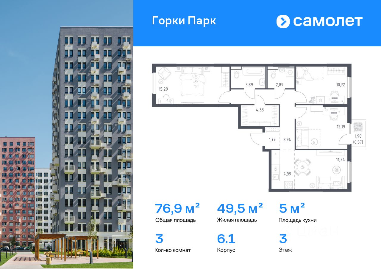 Строим кварталы для жизни с заботой о будущем. Предлагается 3-комнатная квартира комфорт-класса 76,92 кв.м в корпусе 6.1 на 3 этаже, в ЖК "Горки Парк"