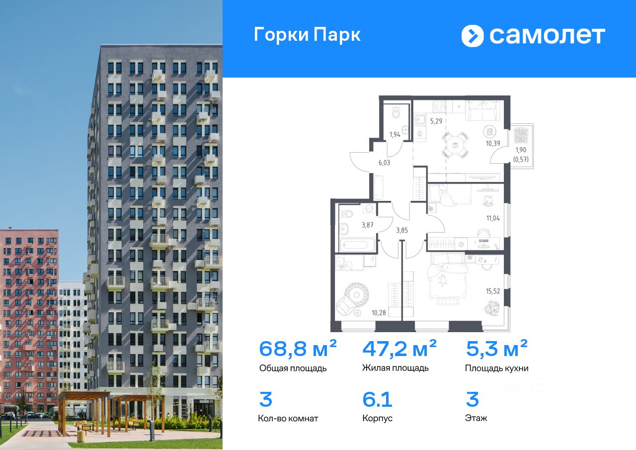 Строим кварталы для жизни с заботой о будущем. Предлагается 3-комнатная квартира комфорт-класса 68,78 кв.м в корпусе 6.1 на 3 этаже, в ЖК "Горки Парк"