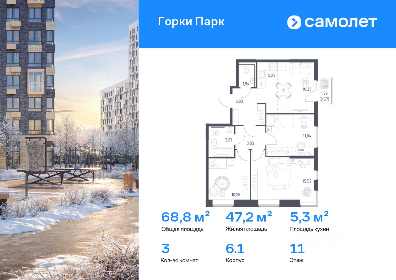 Строим кварталы для жизни с заботой о будущем. Предлагается 3-комнатная квартира комфорт-класса 68,78 кв.м в корпусе 6.1 на 11 этаже, в ЖК "Горки Парк"