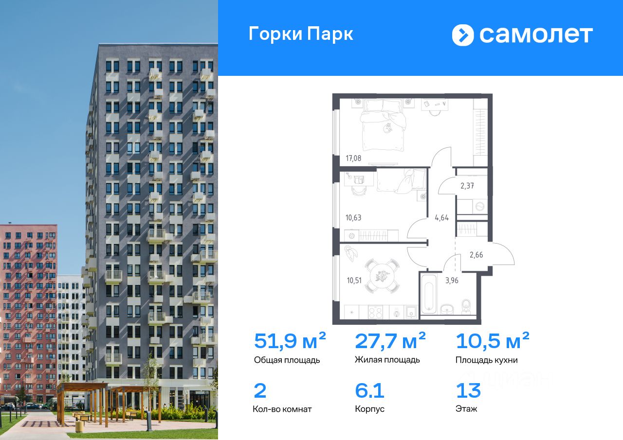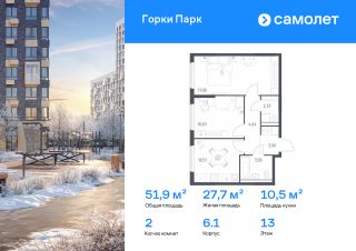 Строим кварталы для жизни с заботой о будущем. Предлагается 2-комнатная квартира комфорт-класса 51,85 кв.м в корпусе 6.1 на 13 этаже, в ЖК "Горки Парк"