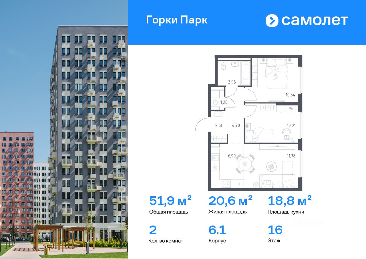 Строим кварталы для жизни с заботой о будущем. Предлагается 2-комнатная квартира комфорт-класса 51,85 кв.м в корпусе 6.1 на 16 этаже, в ЖК "Горки Парк"