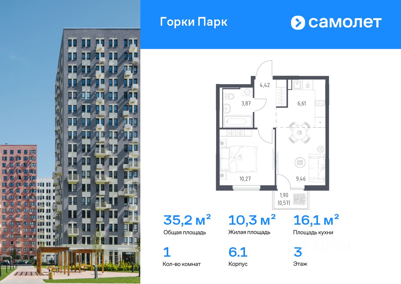 Строим кварталы для жизни с заботой о будущем. Предлагается 1-комнатная квартира комфорт-класса 35,2 кв.м в корпусе 6.1 на 3 этаже, в ЖК "Горки Парк"