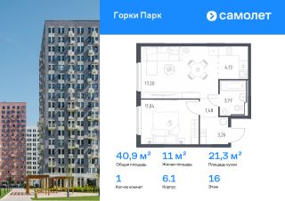 Строим кварталы для жизни с заботой о будущем. Предлагается 1-комнатная квартира комфорт-класса 40,88 кв.м в корпусе 6.1 на 16 этаже, в ЖК "Горки Парк"
