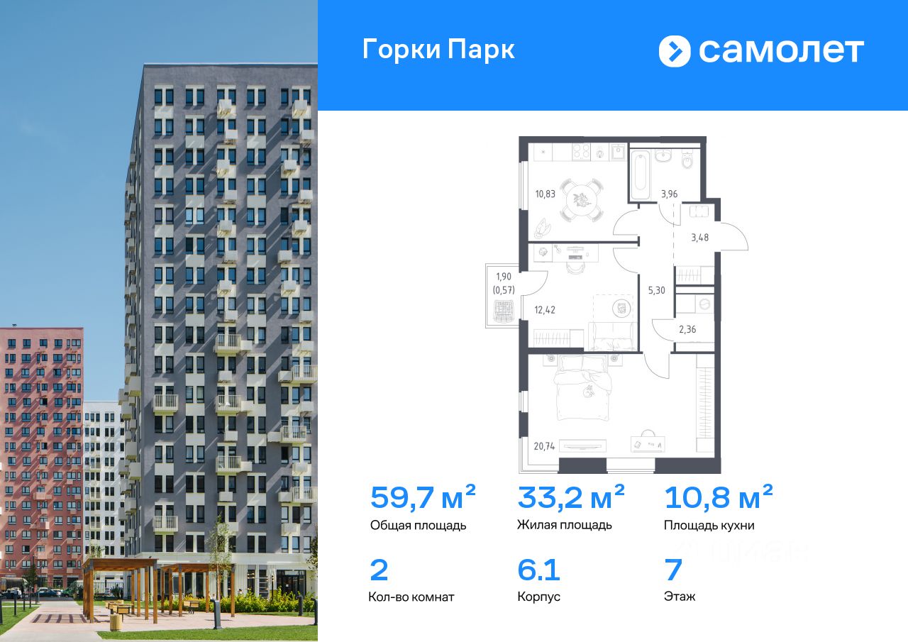 Строим кварталы для жизни с заботой о будущем. Предлагается 2-комнатная квартира комфорт-класса 59,66 кв.м в корпусе 6.1 на 7 этаже, в ЖК "Горки Парк"