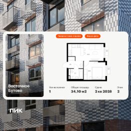 Продаётся 1-комн. квартира площадью 34,1 кв.м на 2 этаже 15 этажного дома (Корпус 47, Секция 2) проекта ПИК Восточное Бутово. Светлый просторный подъезд на уровне земли, функциональная планировка, большие окна, предчистовая отделка.