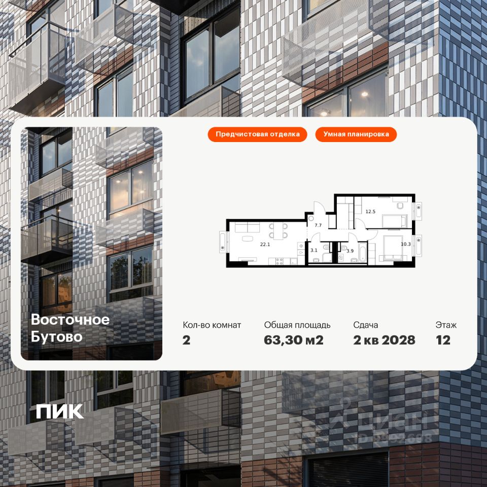 Продаётся 2-комн. квартира площадью 63,3 кв.м на 12 этаже 25 этажного дома (Корпус 48, Секция 4) проекта ПИК Восточное Бутово. Светлый просторный подъезд на уровне земли, функциональная планировка, большие окна, предчистовая отделка.