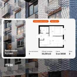 Продаётся 1-комн. квартира площадью 32,5 кв.м на 2 этаже 17 этажного дома (Корпус 48, Секция 1) проекта ПИК Восточное Бутово. Светлый просторный подъезд на уровне земли, функциональная планировка, большие окна, предчистовая отделка.