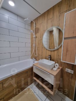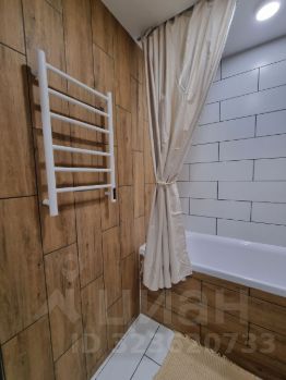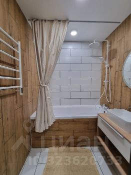 ванная комната с новой плиткой и сантехникой, установлена новая большая ванна с экраном, выложенным плиткой и скрытым люком для доступа к коммуникациям. Подвесная тумба с накладной раковиной и большим зеркалом с подсветкой. Установлен электрический полотенцесушитель.