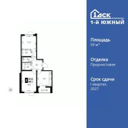 Продаётся 2-к квартира номер 25 общей площадью 59.1 кв.м. на 8-м этаже 24 этажного здания. Отделка Whitebox.