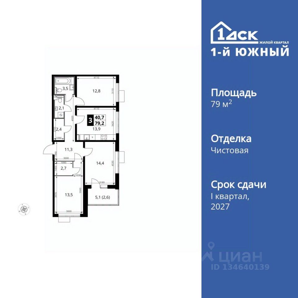 Продаётся 3-к квартира номер 133 общей площадью 79.2 кв.м. на 7-м этаже 24 этажного здания. Чистовая отделка.