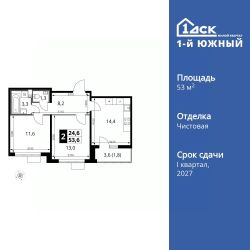 Продаётся 2-к квартира номер 209 общей площадью 53.6 кв.м. на 16-м этаже 24 этажного здания. Чистовая отделка.