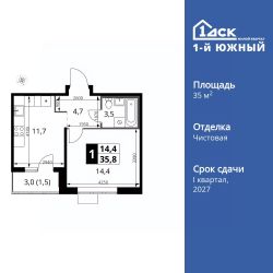 Продаётся 1-к квартира номер 224 общей площадью 35.8 кв.м. на 18-м этаже 24 этажного здания. Чистовая отделка.