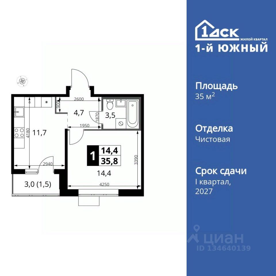 Продаётся 1-к квартира номер 176 общей площадью 35.8 кв.м. на 12-м этаже 24 этажного здания. Чистовая отделка.